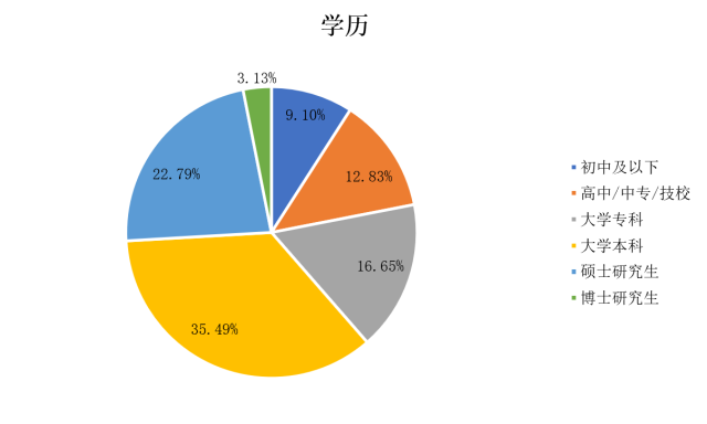 参与本次调查的从业人员有35.49%是大学本科学历,22.79%是硕士研究生学历,而大学专科及以下学历水平的被调查者占全部人数的38.58%,其余为博士研究生学历(3.13%)。