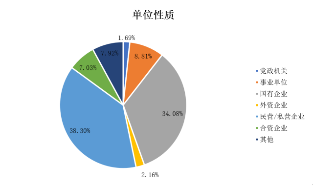 本次调查中,在民营/私营企业工作的被调查对象最多,占全部人数的38.30%;其次为国有企业的被调查对象,占全部人数的34.08%;而仅有1.69%的被调查者在党政机关工作。