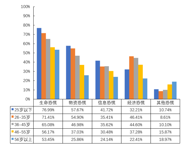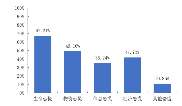 在接受调查的被调查对象中,对于造成恐慌的原因,女性对于造成恐慌的不同来源的整体占比水平要高于男性。对于造成恐慌的原因, 25岁以下的被调查者对于造成恐慌的不同来源的整体水平要高于其他年龄段的被调查者,除了经济来源,26-35岁的被调查者处于最高水平;其次是26-35岁的被调查者,紧随其后的是36-45岁的被调查者。持有硕士研究生学历的被调查者对于生命恐慌的占比最高(70.43%),其次是持有大学本科学历的占比最高为(67.96%),都高于生命恐慌67.21%的整体占比水平。不同受教育程度的被调查者对于物资恐慌和信息恐慌的占比水平相当,并且对于信息恐慌的占比均低于其他几类恐慌原因的占比。对于生命恐慌,学生群体(78.17%)、专业技术人员(72.49%)和一般性事务人员(71.90%)的占比较高,服务人员、管理人员和个体劳动者的占比相对较低,分别为60.53%、61.03%和61.11%。对于物资恐慌,这三类人员的占比也较高,农民、个体劳动者和工人对物资恐慌的占比相较其他职业背景的被调查者较低。商务人员对于信息的恐慌最低,为25.00%。除学生(19.80%)以外,不同职业背景的被调查者对于经济恐慌的占比相对较高,接近或高于经济恐慌41.72%的整体占比水平。