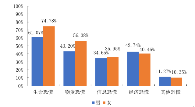 在接受调查的被调查对象中,对于造成恐慌的原因,如图17所示,女性对于造成恐慌的不同来源的整体占比水平要高于男性。其中,女性对于生命恐慌(74.78%)和物资恐慌(56.38%)的占比都要明显高于男性对于生命恐慌(61.07%)和物资恐慌(43.20%)的占比。与此相反,女性(40.46%)对于经济恐慌的占比要低于男性(42.74%)。由于信息量大的原因对男性(34.65%)和女性(35.95%)造成的恐慌占比相当。