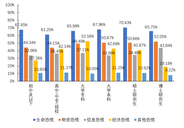 接受调查的不同受教育程度的被调查者对于造成恐慌的原因的占比存在差异,其中持有硕士研究生学历的被调查者对于生命恐慌的占比最高,为70.43%,其次是持有大学本科学历的占比最高为,67.96%,都高于生命恐慌67.21%的整体占比水平;相较于其他学历的被调查者,持有大学专科学历的被调查者对于经济恐慌的占比最高(52.58%)。不同受教育程度的被调查者对于物资恐慌和信息恐慌的占比水平相当,并且对于信息恐慌的占比均低于其他几类恐慌原因的占比。