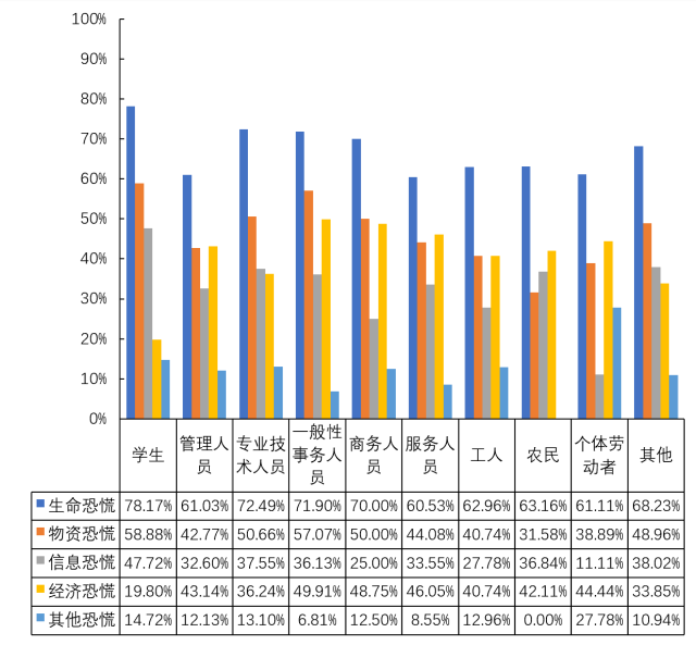 接受调查的不同职业背景的被调查者,对于造成恐慌的原因的占比存在差异,如图20所示,其中,学生群体(78.17%)、专业技术人员(72.49%)和一般性事务人员(71.90%)对于生命恐慌的占比较高,均高于生命恐慌67.21%的整体占比水平;相较于其他职业背景的被调查者,这三类人员对于物资恐慌的占比也较高,分别是学生58.88%,一般性事务人员57.07%和专业技术人员50.66%。同时学生对于信息的恐慌占比也较高,为47.72%。相较于其他职业背景的被调查者,服务人员、管理人员和个体劳动者对于生命恐慌的占比相对较低,分别为60.53%、61.03%和61.11%。农民、个体劳动者和工人对物资恐慌的占比相较其他职业背景的被调查者较低,分别为31.58%、38.89%和40.74%。商务人员对于信息的恐慌最低,为25.00%。除学生(19.80%)以外,不同职业背景的被调查者对于经济恐慌的占比相对较高,接近或高于经济恐慌41.72%的整体占比水平。