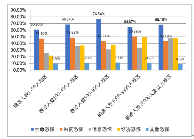 根据各地截至2020年2月10日24时新型肺炎确诊人数,我们对全国34个省市、自治区、直辖市和特别行政区重新进行了疫情地区划分,并针对来自全部5个疫情地区(确诊1-99人地区、100-499人地区、500-999人地区、1000-9999人地区、10000人及以上地区)的被调查对象有关疫情的恐慌程度进行了分析。
