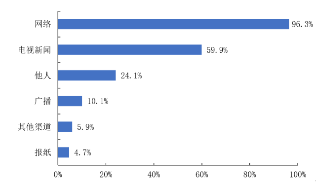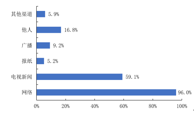 大众信息渠道调查显示:96.3%的被调查者表示会通过网络了解新冠肺炎的信息,59.9%的被调查者通过电视新闻了解信息,明显多于其他信息渠道——他人(24.1%),广播(10.1%),其他渠道(5.9%),报纸(4.7%)。(图22)