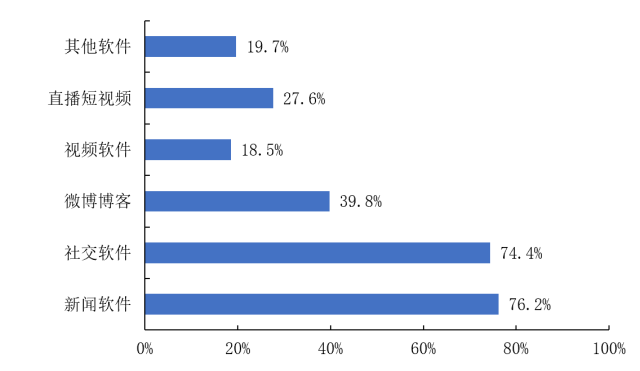 其中,网络为最大的传播渠道。具体来看,新闻软件及社交软件是最重要的两大网络传播渠道,分别为76.2%,74.4%,明显高于微博博客(39.8%),直播短视频(27.6)视频软件(18.5%),其他软件(19.7%)。(图23)