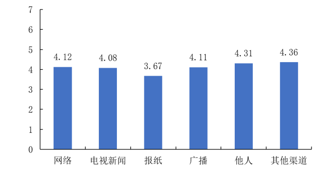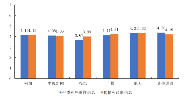 同样地,我们分析了不同的传播和诊断信息渠道下,被调查者所感受到的恐慌程度。结果显示:报纸同样是恐慌程度最低的信息渠道(3.99),其余信息渠道的恐慌程度分别为:他人(4.32)、广播(4.21)、其他渠道(4.19)、网络(4.12)、电视新闻(4.06)。(图28)