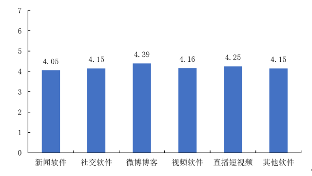 具体到不同的网络渠道发现:微博仍然反映出了最高的恐慌水平(4.39),其他几类网络渠道的恐慌程度分别为:直播短视频(4.25)、视频软件(4.16)、社交软件(4.15)、其他软件(4.15)、新闻软件(4.05)。(图29)