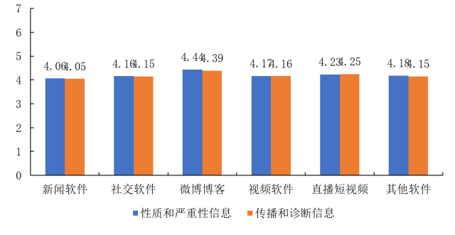 具体到网络渠道发现:不论是何种性质的信息,微博博客均是恐慌程度最高的信息渠道。新闻软件则是恐慌程度最低的信息渠道。(图31)