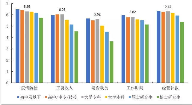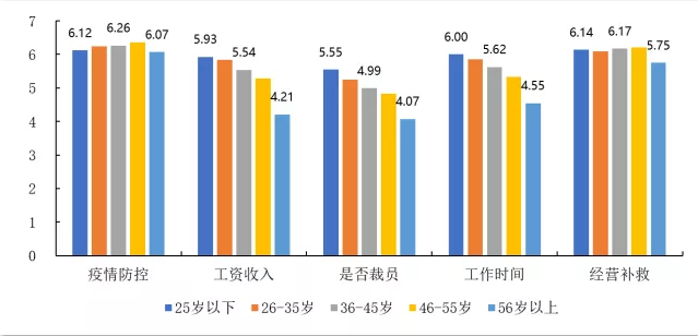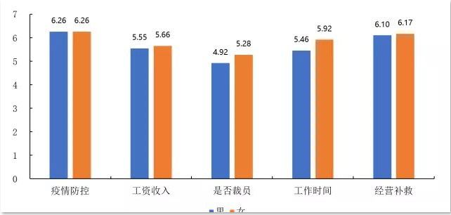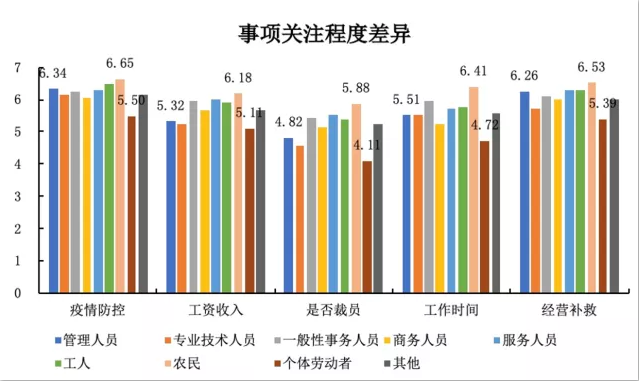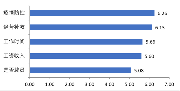 总的看来,被调查者对于企业以上几个问题的关注度排序如下:疫情防控、经营补救、工作时间、工资收入、是否裁员。