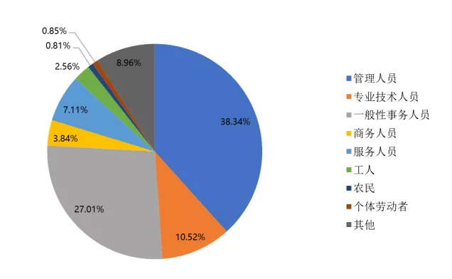 在所有被调查对象中,管理人员占比最大,为38.34%,其次是一般性事务人员(27.01%),再次是专业技术人员(10.52%);个体劳动者与农民占比最少,分别为0.85%和0.81%。