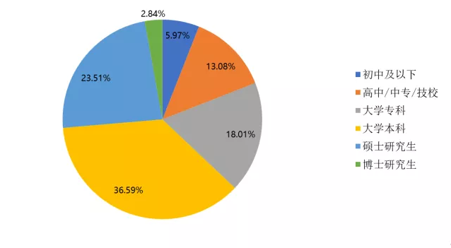 参与本次调查的从业人员有36.59%是大学本科学历,23.51%是硕士研究生学历,而大学专科及以下学历水平的被调查者占全部人数的37.06%,其余为博士研究生学历(2.84%)。