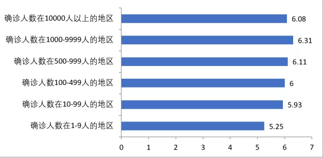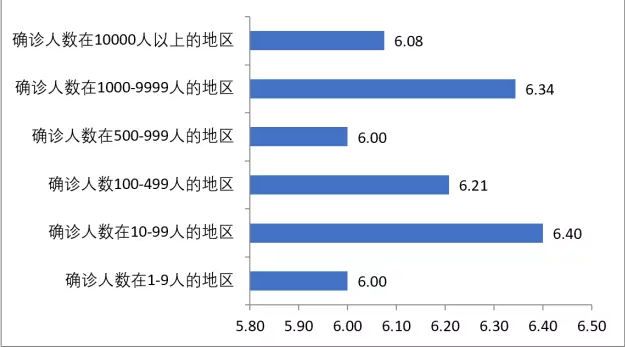 在接受调查的从业人员中,对于疫情防控的关注程度全国平均水平是6.26分,确诊人数在10-99人的地区和确诊人数在1000-9999人的地区的从业人员对于疫情防控关注程度的平均水平分别达到了6.40分和6.34分,高于全国平均水平,其他地区从业人员对于疫情防控关注程度普遍接近全国平均水平。