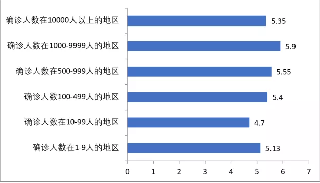 在接受调查的从业人员中,对于经营补救的关注程度全国平均水平是6.13分,各个地区对于经济补救的关注程度的平均水平与全国平均水平接近,确诊人数在1-9人的地区的关注程度明显低于全国平均水平,为5.25分。