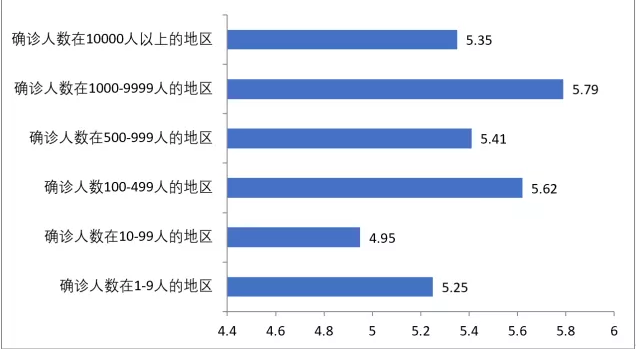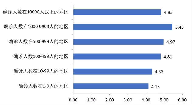 在接受调查的从业人员中,对于工资收入的关注程度全国平均水平是5.60分,确诊人数在1000-9999人的地区的从业人员对于工资收入的关注程度高于全国平均水平,为5.90分,其他地区均低于全国平均水平。
