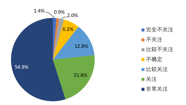 本次调查显示,从业人员对公司疫情防控措施的关注度较高。近八成被调查对象表示关注企业的疫情防控措施。如图14所示,非常关注(59.4%),关注(19.8%),比较关注(12.3%),明显高于不关注的群体,完全不关注(0.7%),比较不关注(1.4%),不关注(0.5%)。