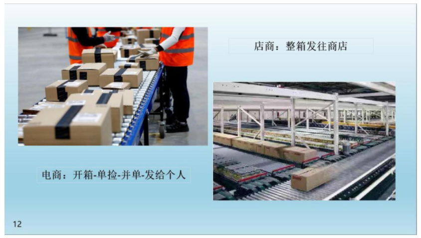 传统超市的货进到库里以后,上传送带,整箱整箱地分拨到各个门店。超市外边等着的卡车,把整箱整箱的商品就拉到门店去了。