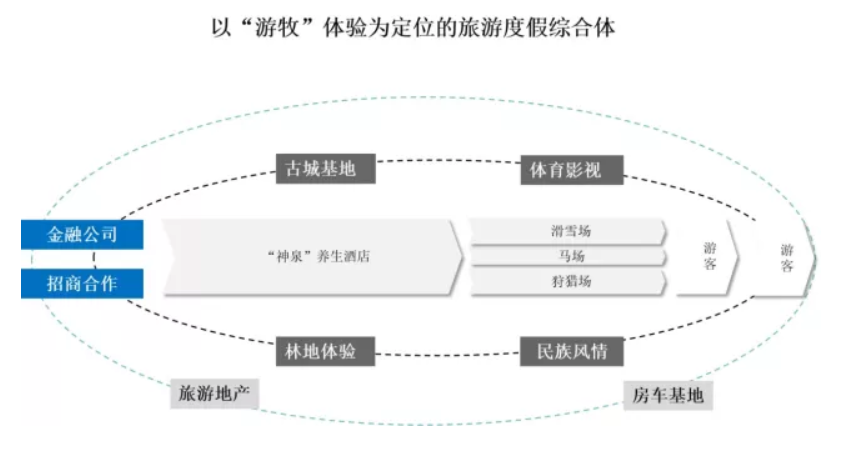 首先要回答的是,客户为什么要过来,和区域内旅游目的地的差异在哪里?这个旅游区包含了“游牧”体验的所有元素,相较于周边乃至全球,没有人提出这个定位。因此,定位于“游牧”体验,是具有独特性的。另一个,由于区域吸引力没有形成,房地产没法形成收入的第一引擎,那么,战略路径应该怎么办?首先规划酒店、滑雪场、马场和狩猎场,这也是一个游牧体验的小闭环。这样的一个业务组合,投资不会超过2-3个亿;提升了客流量后,进而古城基地、体育影视、林地体验、民族风情等等都可以被带动起来;在品牌和人流形成后,旅游地产、房车基地等等规划都能实现。