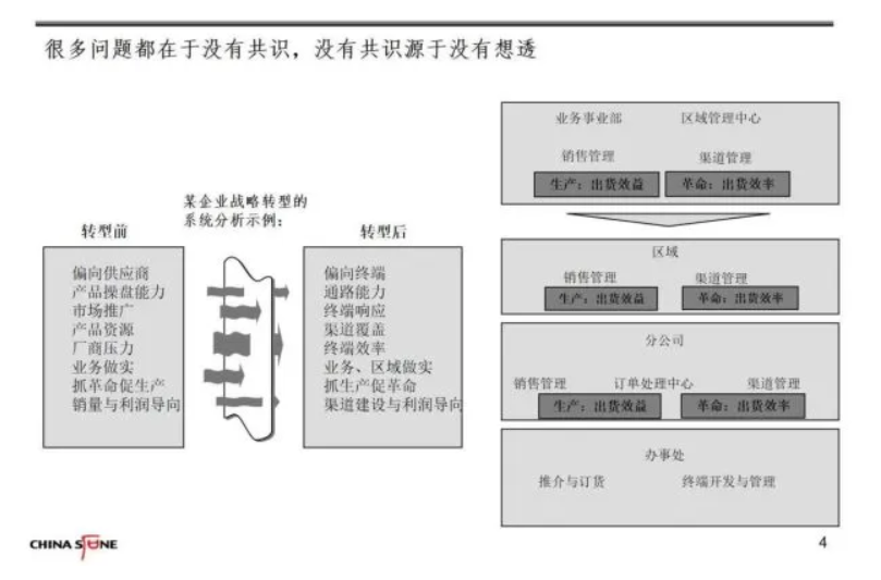 比如,在转型之前,是产品驱动,上游产品供应商更重要,那么向渠道服务商转型,终端、终端覆盖、终端服务更重要。再举两个例子来看这种转型后的逻辑的不同:比如,原来主要是产品的营销策略和落地执行,现在,就要管理订单的效率,还要管理渠道终端的库存、信用、换货、退货等等;再比如,以前是供应商导向,需要“忽悠”型人才,能够和供应商销售打成一片,现在转为渠道服务导向,需要“黄牛”型人才,才能够把渠道服务做细、做实、做好,那么招聘逻辑就发生了改变,就要向快消品行业如宝洁、康师傅等引进人才。通过上面两个例子,大家就能够体会到战略转型会带来商业逻辑的转型,也会带来一系列行动导向的变化。