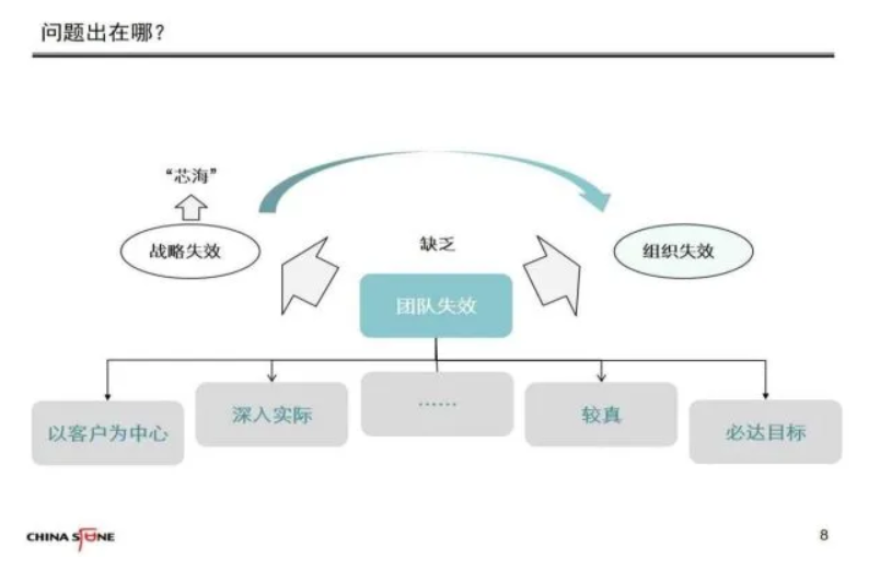 最后,战略失效其实是文化失效,文化失效是最底层原因。想透了上述问题,就代表把真正的问题想透了吗?还不是,还要继续追问,为什么战略会失效呢?原来战略失效是由文化失效引起的。比如,为什么会用“芯海战术”?难道是公司不会产品战略管理工具?事实上,产品规划做得非常专业,问题出在大家不是“以客户为中心”,没有把下列问题“深入实际”研究透:客户是谁?客户的需求和痛点是什么?客户的用户是谁?用户的需求和痛点是什么?用户的技术和应用发展趋势是什么?有哪些竞争对手,竞争对手有哪些竞品?优劣势是什么?未来的想法会是什么?……所以做产品规划时,心中可能没底,那就多做几颗吧,总有一颗做对吧,于是就产生了“芯海战术”。那么,为什么大家不“以客户为中心,深入实际”呢?原来公司从老板开始,都过于和善,没有较真、必达目标的习惯。其实知道有问题,但是太过和善,不去较真,许多事情就不了了之。