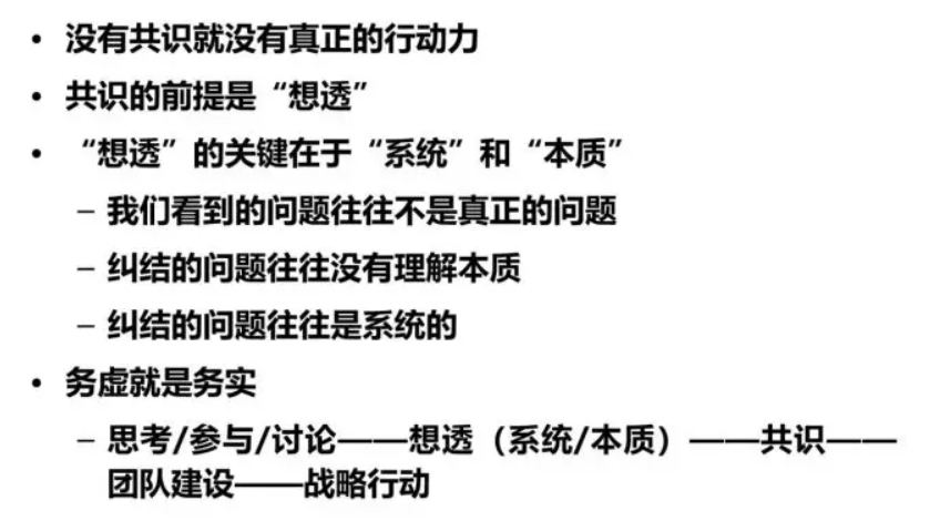 基于对如上案例的讨论,大家能否体会到“共识”的重要性?而共识的关键在于“想透”。想透的重要性是因为我们看到的问题不一定是真正的问题,而且越是纠结的问题往往越是系统因素造成的。我们需要不断追问,需要花一定的时间“务虚”,组织大家思考、讨论,促进想透,达成共识,才能真正形成战略行动力。